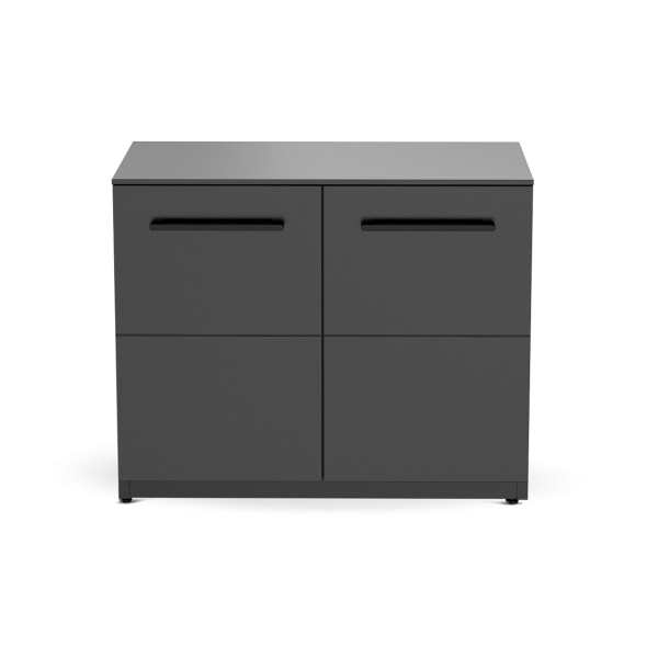 matt fekete felületkezeléssel, nagy teherbírással (akár 200 kg modulonként). Az ajtók és fiókok magasnyomású laminált (HPL) borítást kaptak, az alumínium fogantyúk pedig modern, letisztult megjelenést biztosítanak.