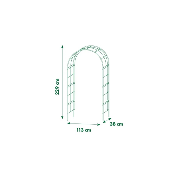 • A 229 cm magas és 113×38 cm méretű íves kapu elegáns átjárót képez, amely segíti a növények rendezett növekedését és díszítő elemként is kiemelkedik.