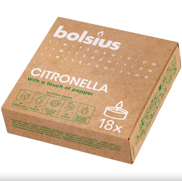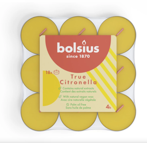 A Bolsius citronella teamécsesek természetes kivonatokat tartalmaznak, akár 4 órán keresztül égnek. A szúnyogok elriasztására egyik legyakrabban alkalmazott illóolaj a citronella (Cymbopogon nardus), ami kifejti hatását.