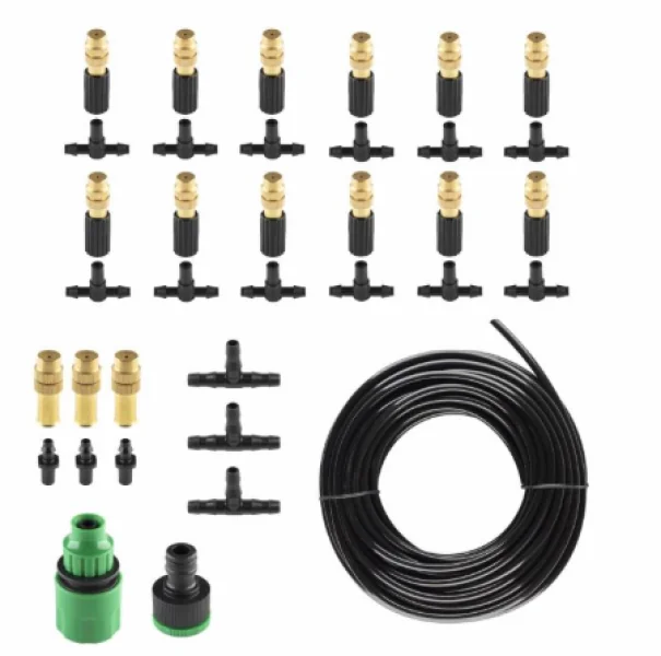 • Készlet tartalma 12m / átmérő 6.35mm fekete PVC cső, 3db T-elosztó a csőhálózathoz , 12db réz porlasztó fúvóka T-elosztóval, 3db réz porlasztó fúvóka véglezáróval, gyorscsatlakozó és G1/2” csap adapter